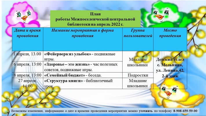 План работы Межпоселенческой центральной библиотеки на апрель 2022г.