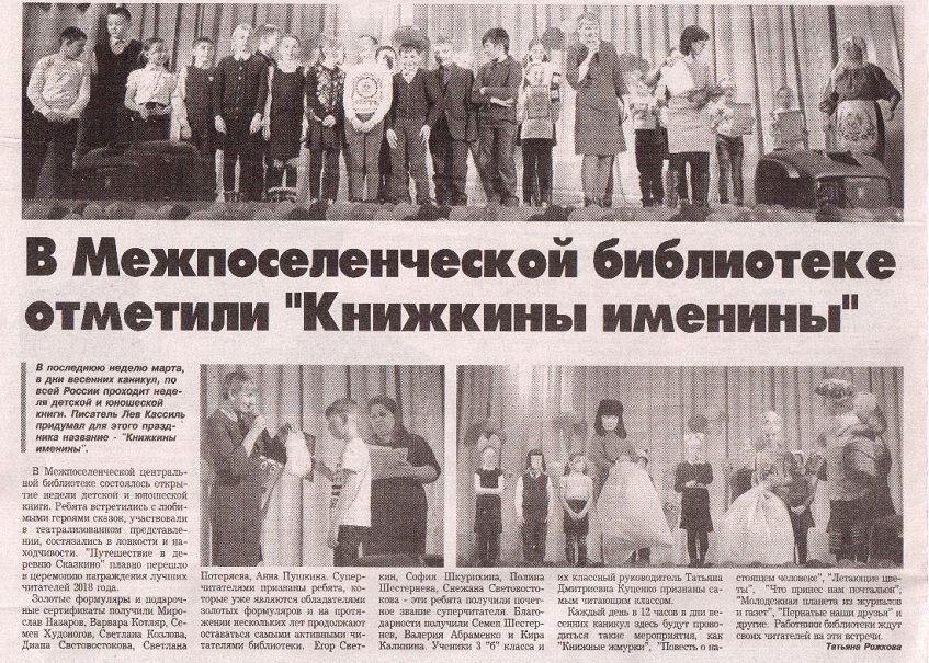 12. Рожкова, Т. В Межпоселенческой библиотеке отметили «Книжкины именины» //Тракт. – 2018. - №13. – С.4.