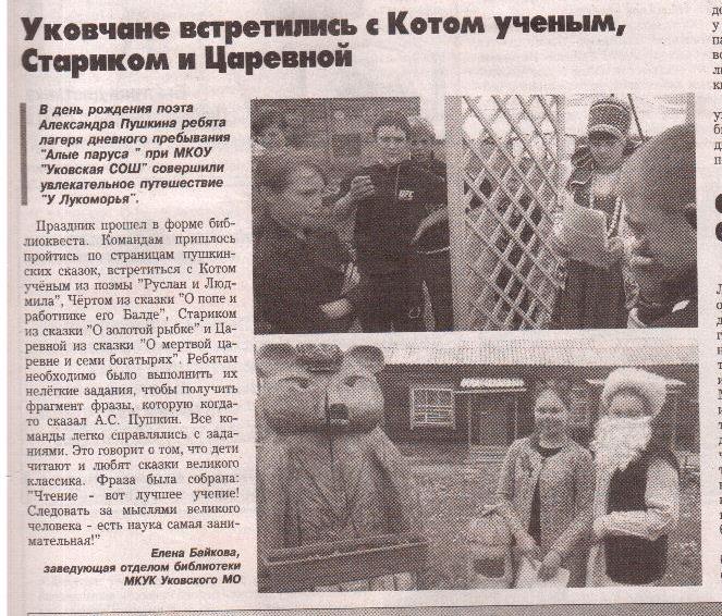 В статье рассказывается о том, как в Уковской библиотеке провели библиоквест «У Лукоморья», посвященного Пушкинскому дню России. ПОСМОТРЕТЬ