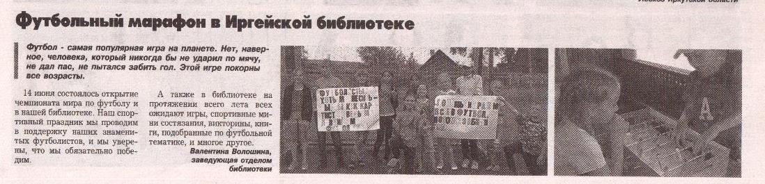 34. Волошина, В. Футбольный марафон в Иргейской библиотеке/Валентина Волошина// Тракт. – 2018. - №25.- С.7. ПОСМОТРЕТЬ