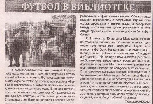 44. Рожкова, Т. Футбол в библиотеке/Татьяна Рожкова//Наше время – Нижнеудинское. – 2018. - №27. – С.7. ПОСМОТРЕТЬ