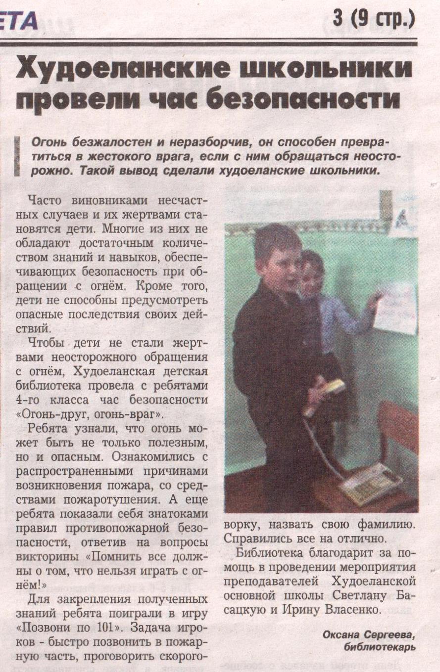 Час безопасности «Огонь – друг, огонь – враг» с учениками 4 класса был проведен в Худоеланской детской библиотеке. скачать