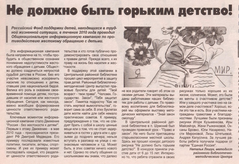 Об организации работы Центральной районной библиотеки п. Шумского в рамках Общенациональной информационной кампании по противодействию жестокому обращению с детьми. посмотреть