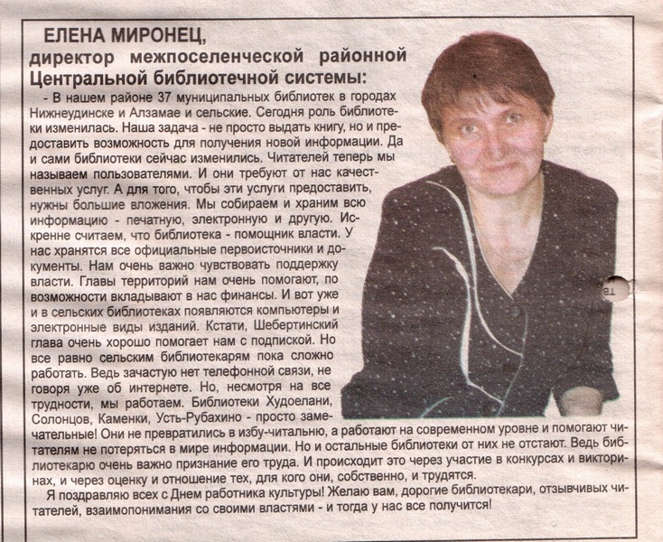 Поздравление библиотекарей директора Межпоселенческой центральной библиотеки Е. П. Миронец с днем работника культуры. посмотреть