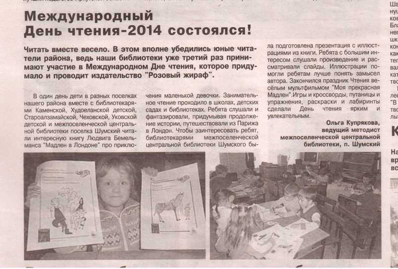 11. Купрякова, О. Международный День чтения – 2014 состоялся! // Тракт. – 2014. - №22. – С.2. – (прилож. «Школьная газета)