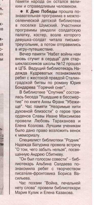 12. Библиотечные уроки добра. История о библиотекаре Шумской поселковой библиотеки победила в Областном конкурсе «Библиотечные истории» // Тракт. – 2014. - №22. – С.2. посмотреть